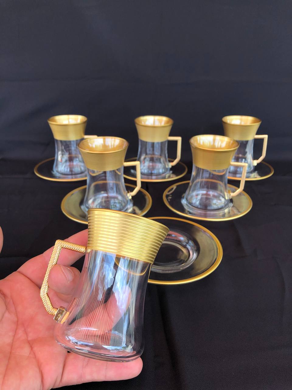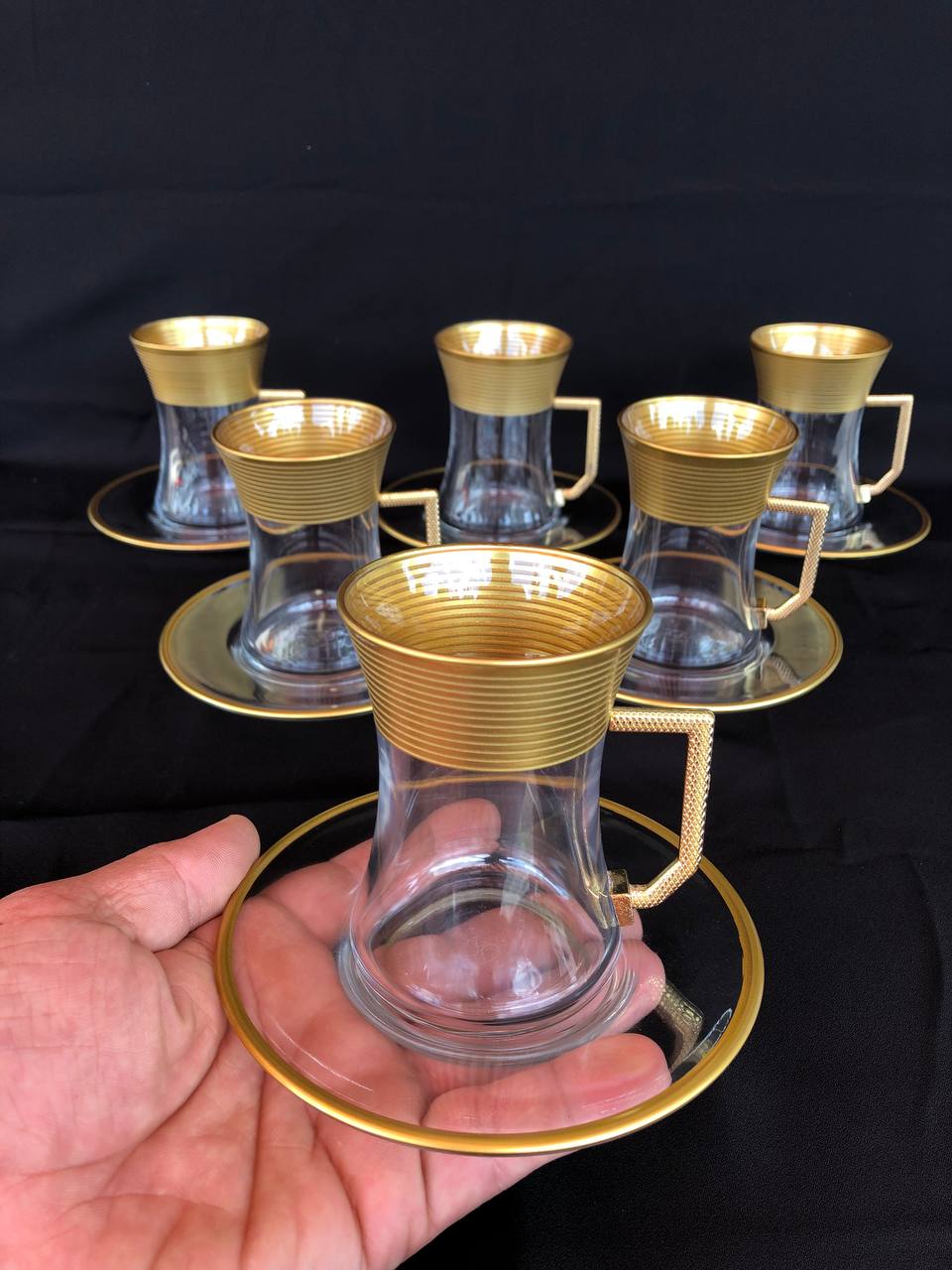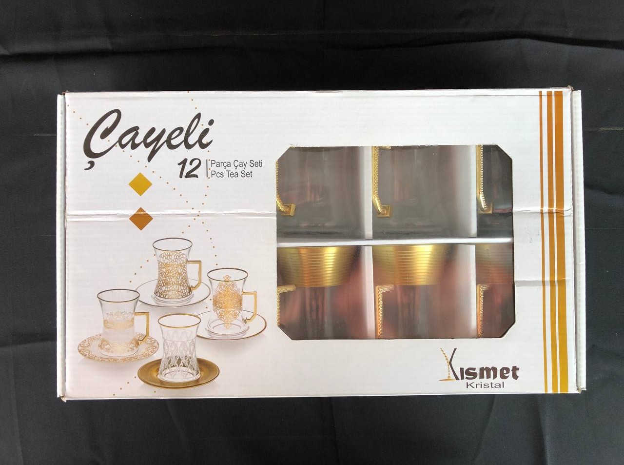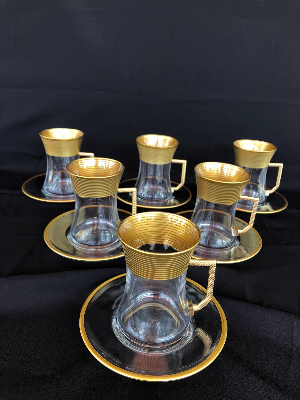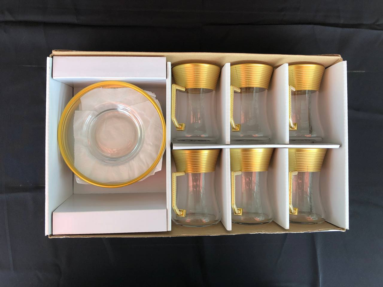 12 PARÇA ÇAYELİ ÇAY SETİ GRAVÜR AĞIZ KAPLAMA YATAY ÇİZGİ