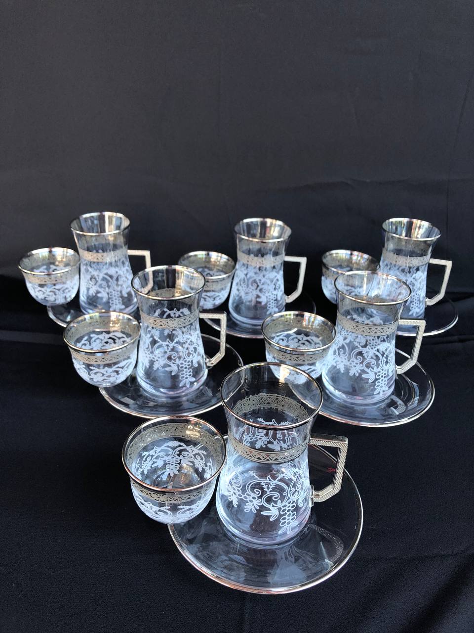 18 Parça Mıralı Duru Çay seti Gravür Platin Bant Salkım