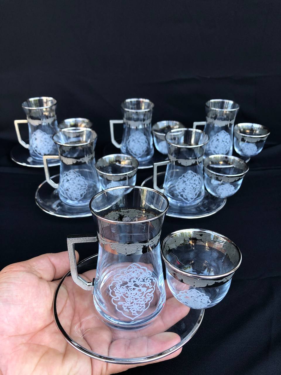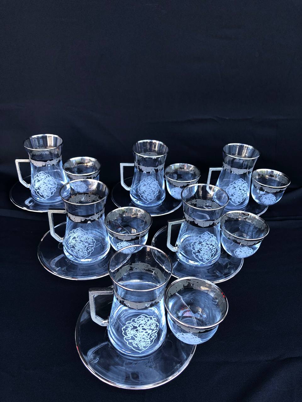 18 Parça Mıralı Duru Çay seti Gravür Platin Bant Sarkıt