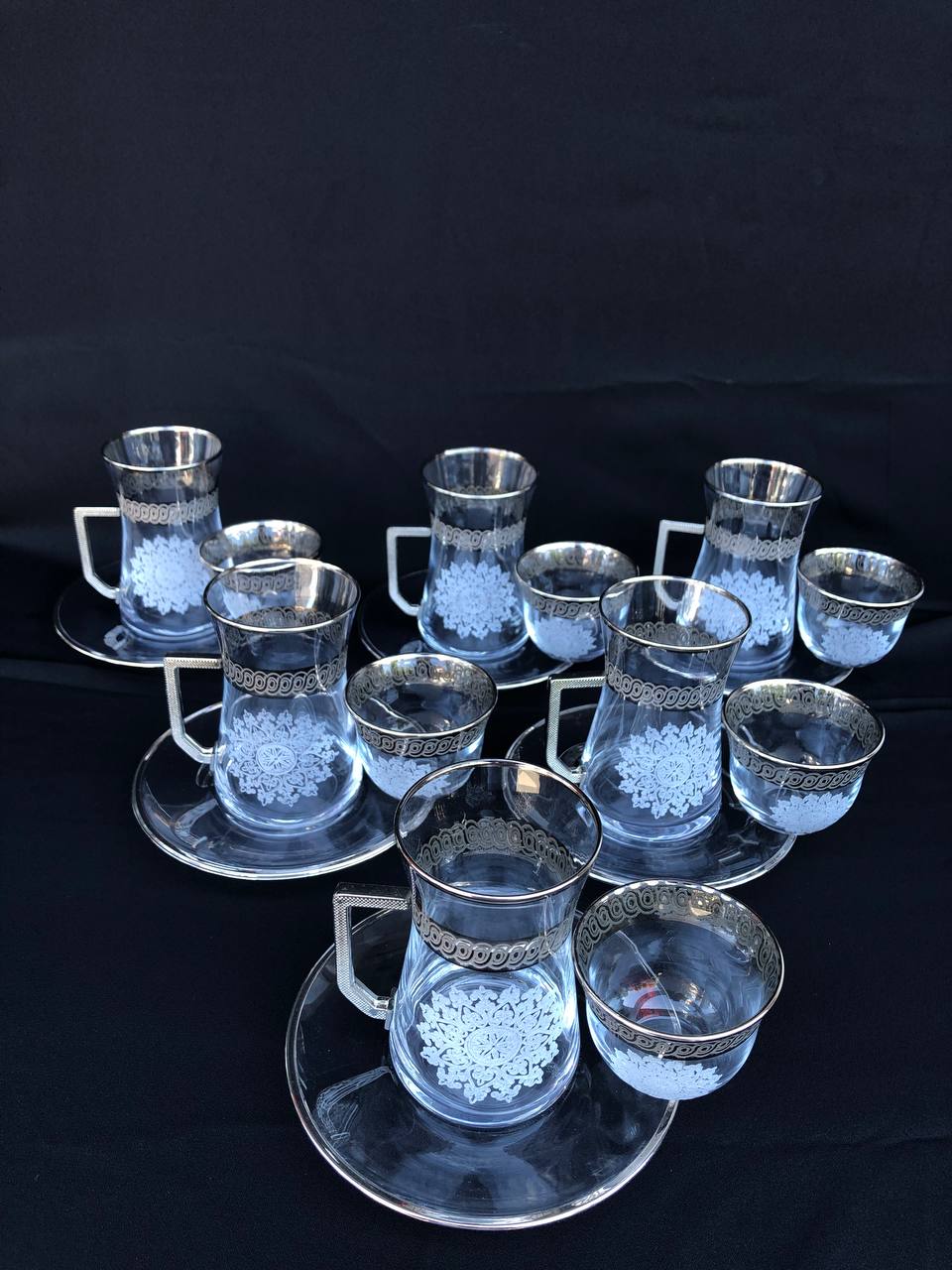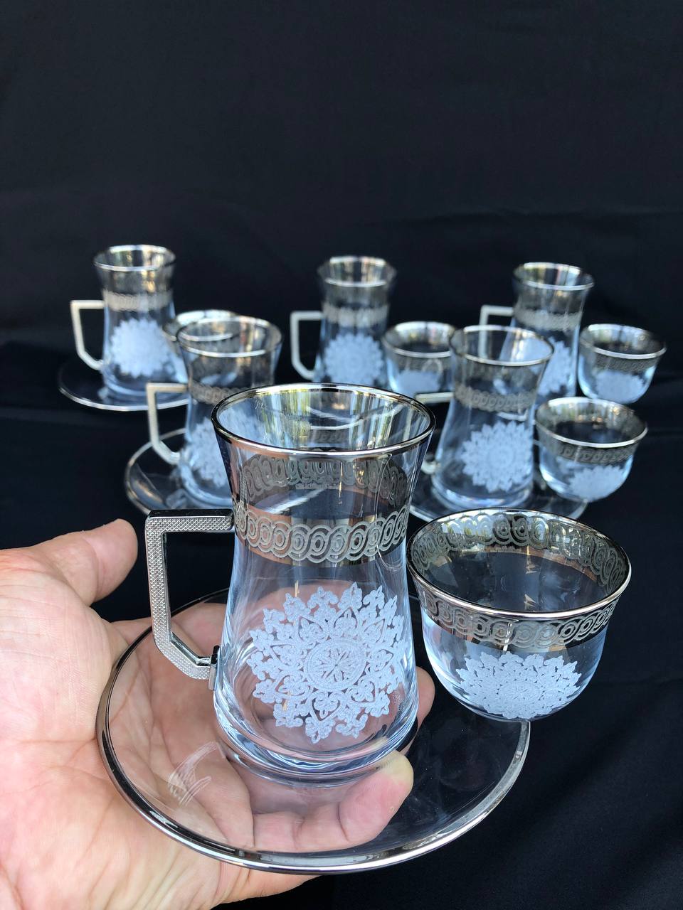 18 Parça Mıralı Duru Çay seti Gravür Platin Bant Zincir