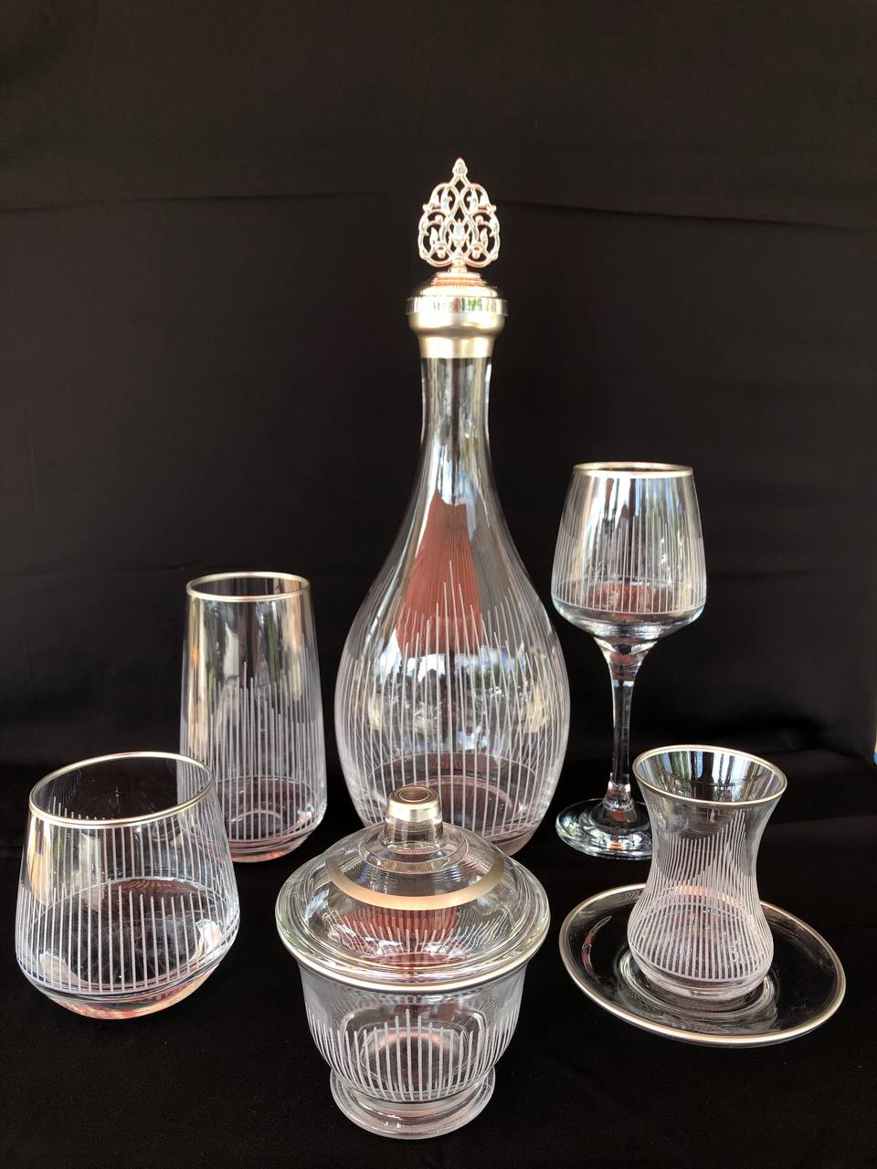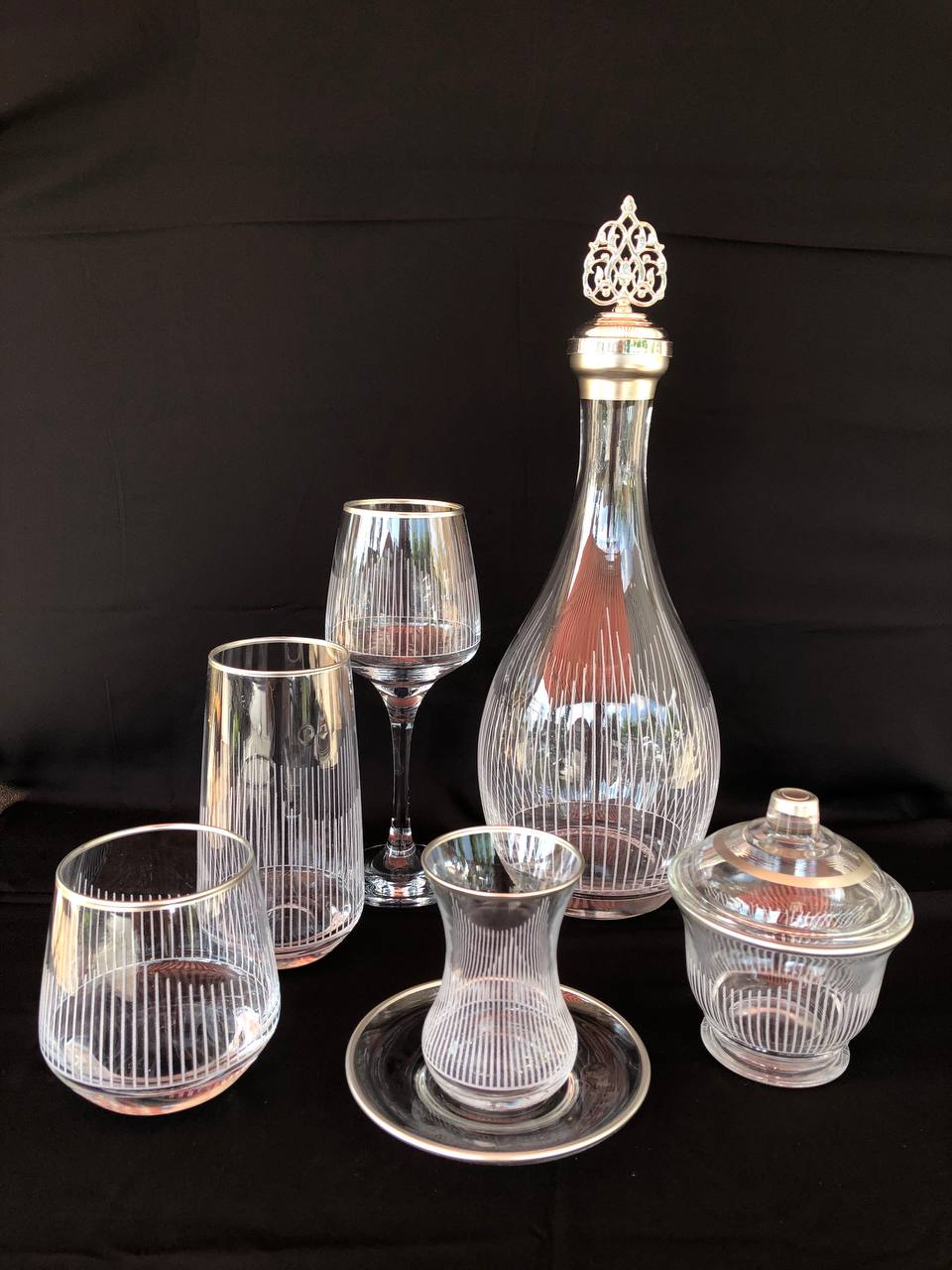 31 Parça Çeyiz seti Gravür Üçgen Çizgi Gümüş Ağız Soğuk Boya (+ Şekerlik Hediyeli)