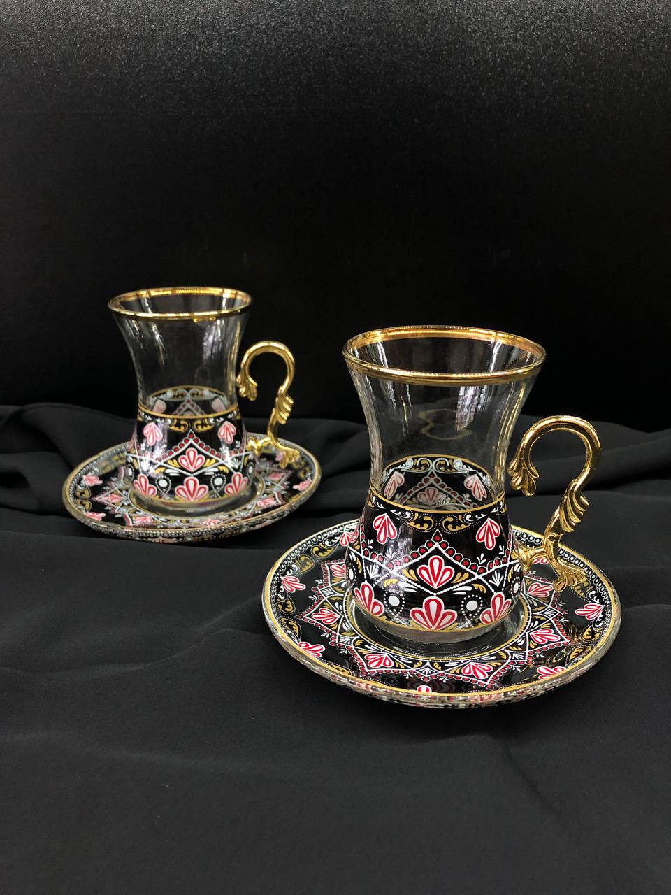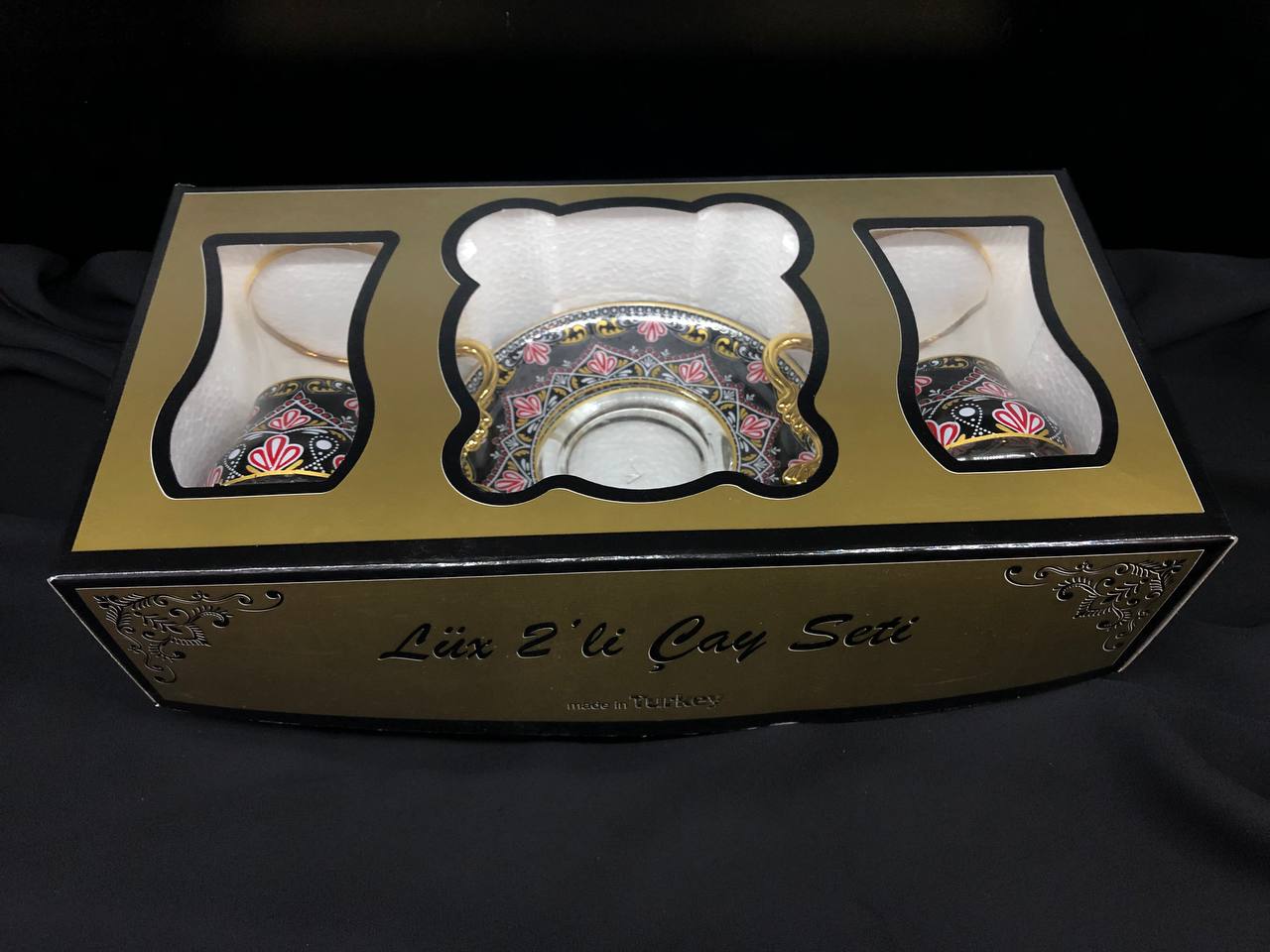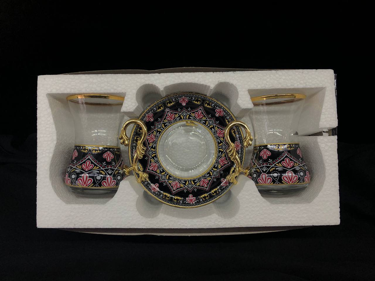 4 Parça İncebelli Çay Seti Ağız & Tabak Yaldız Siyah Kilim (2Kişilik)