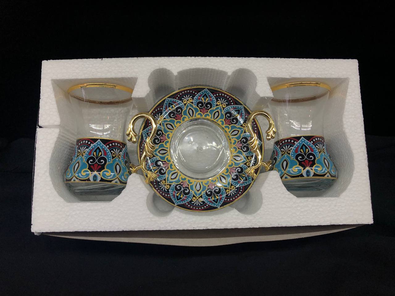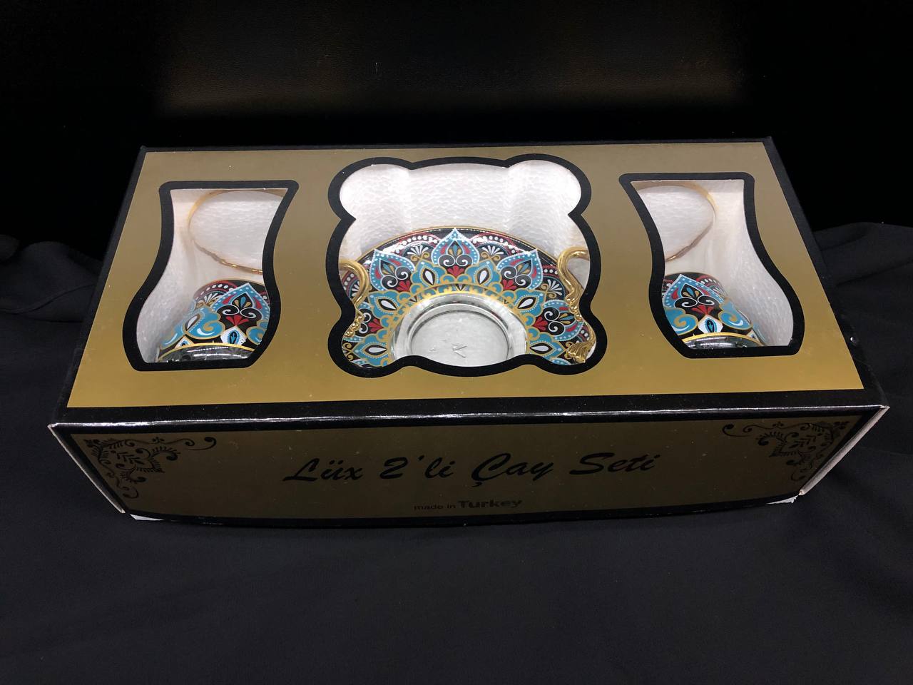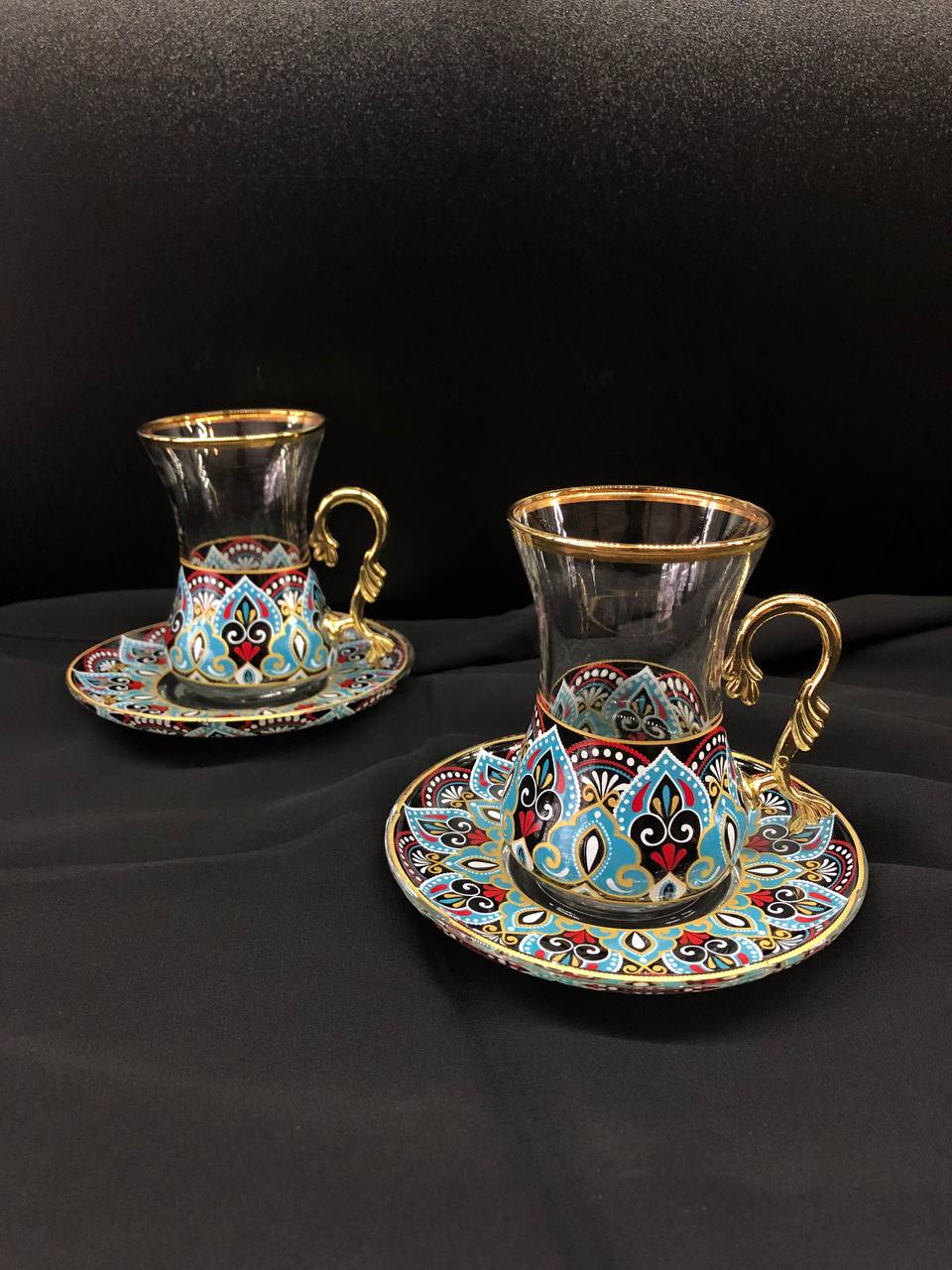 4 Parça İncebelli Çay Seti Ağız & Tabak Yladız Mavi Kilim (2 Kişilik)